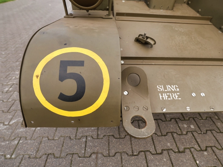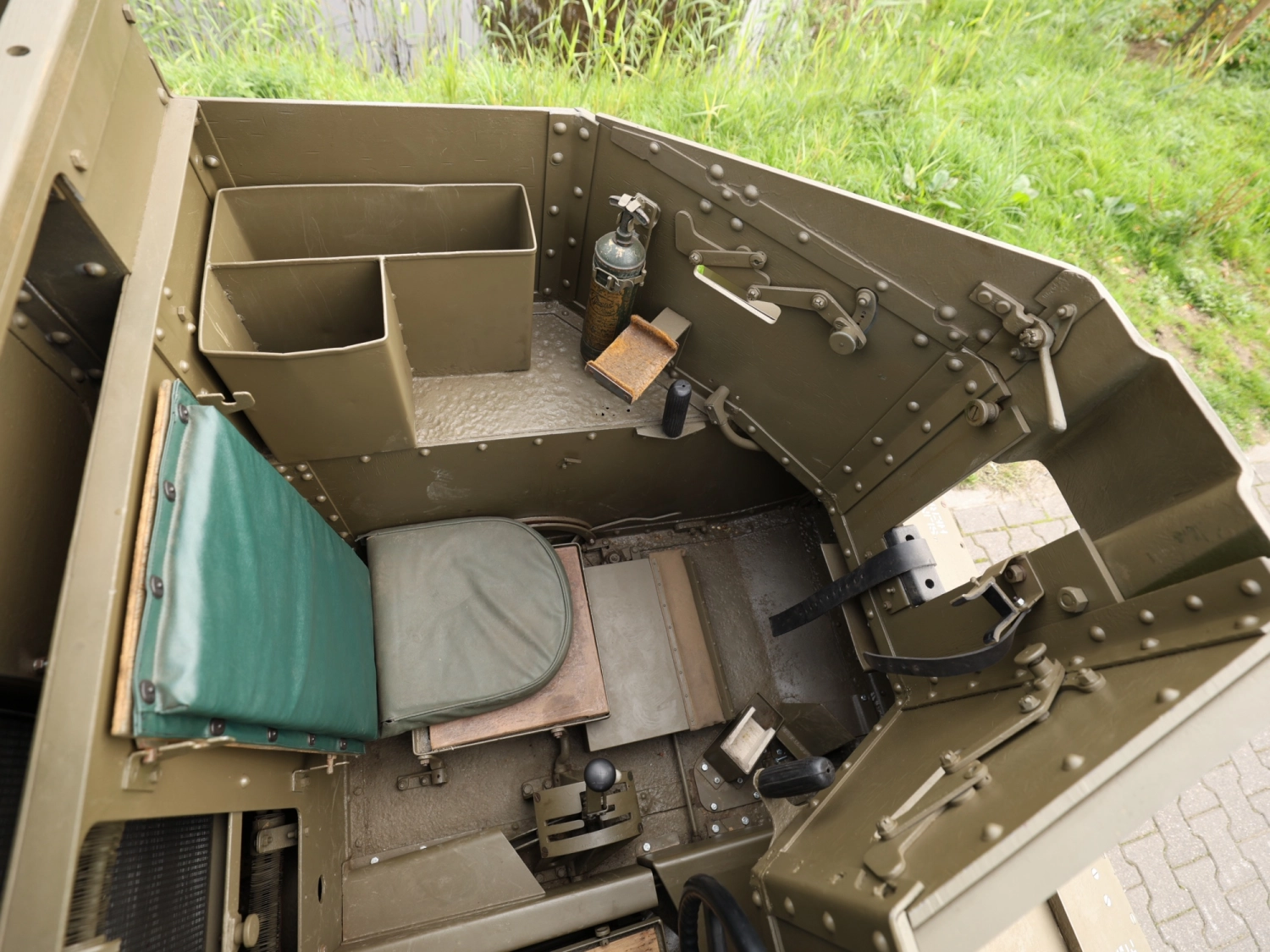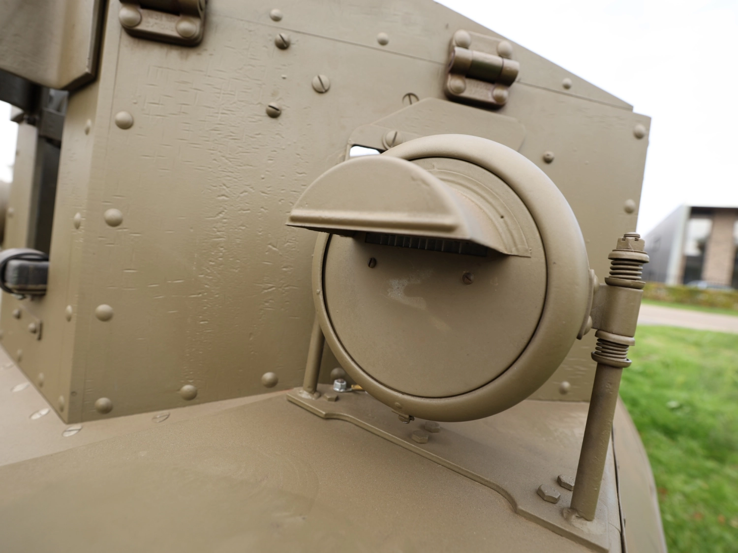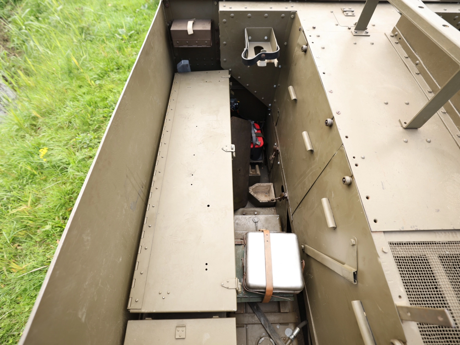 This early Mk I* Carrier originally came from Australia and has undergone a complete restoration. The vehicle was restored using original armor plates and has been converted to a reliable 12-volt electrical system. Many original stowage boxes and some newly manufactured. It is fitted with new NOS road wheels and sprockets, while the fuel tanks and exhaust system have been newly, but period correct, fabricated in stainless steel. Also the tracks are in good condition. Technically, the Carrier is in excellent mechanical condition and performs very well.