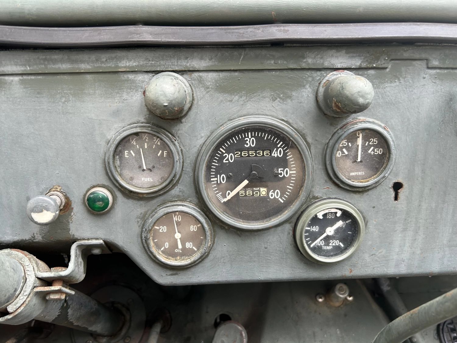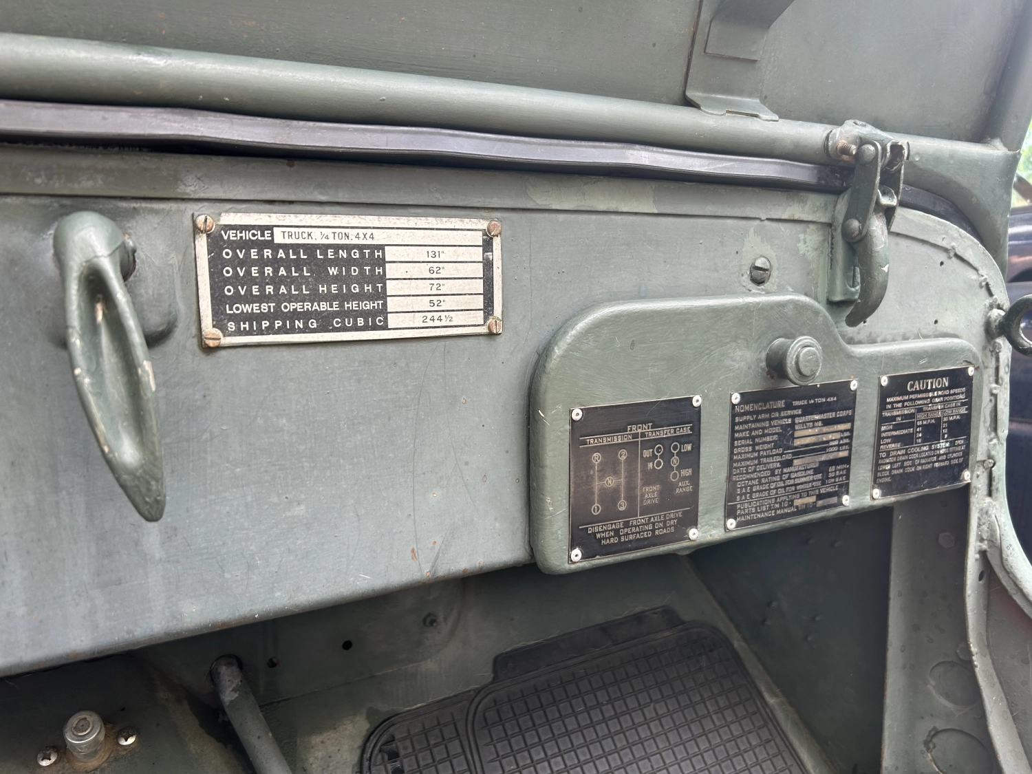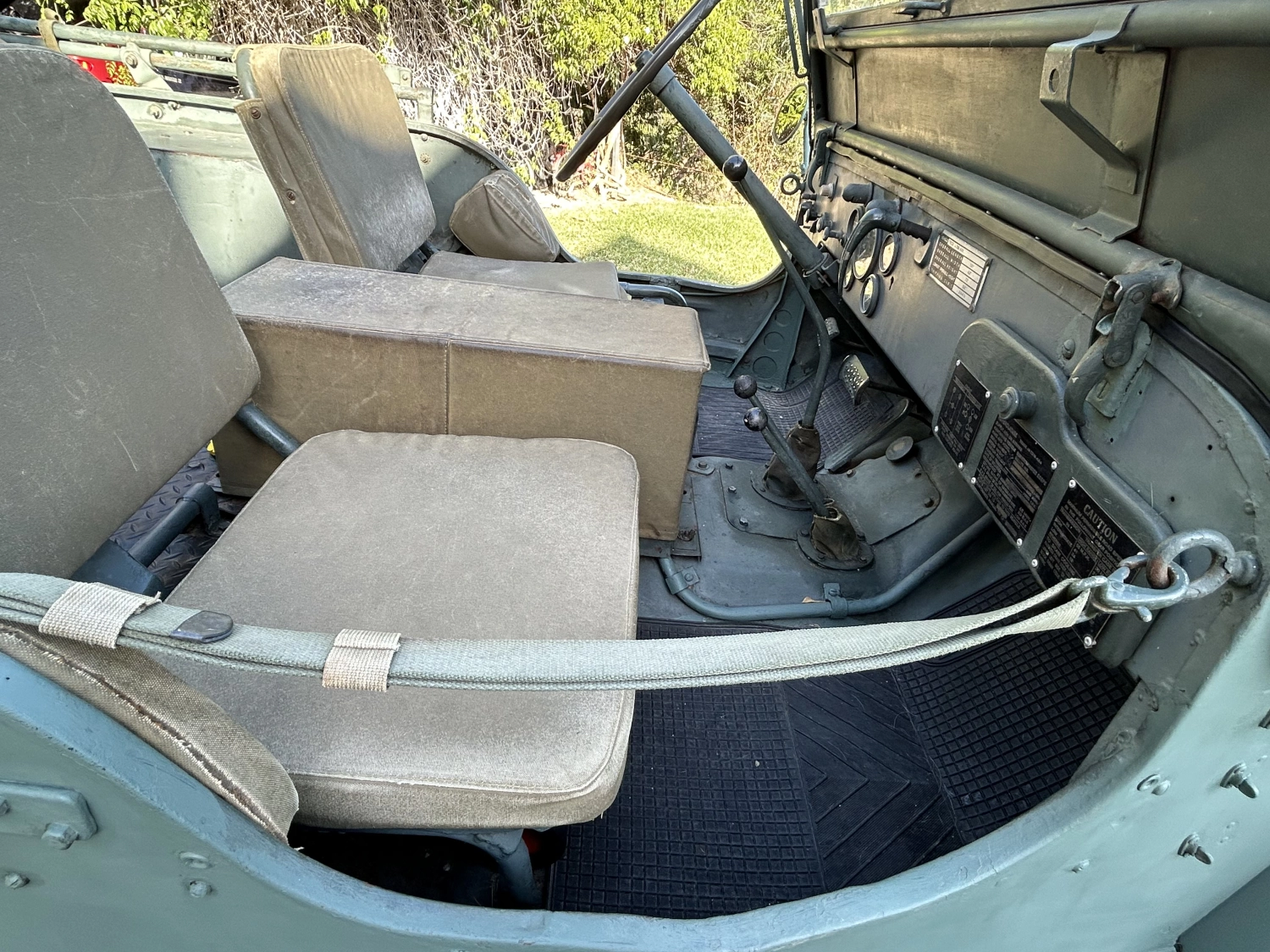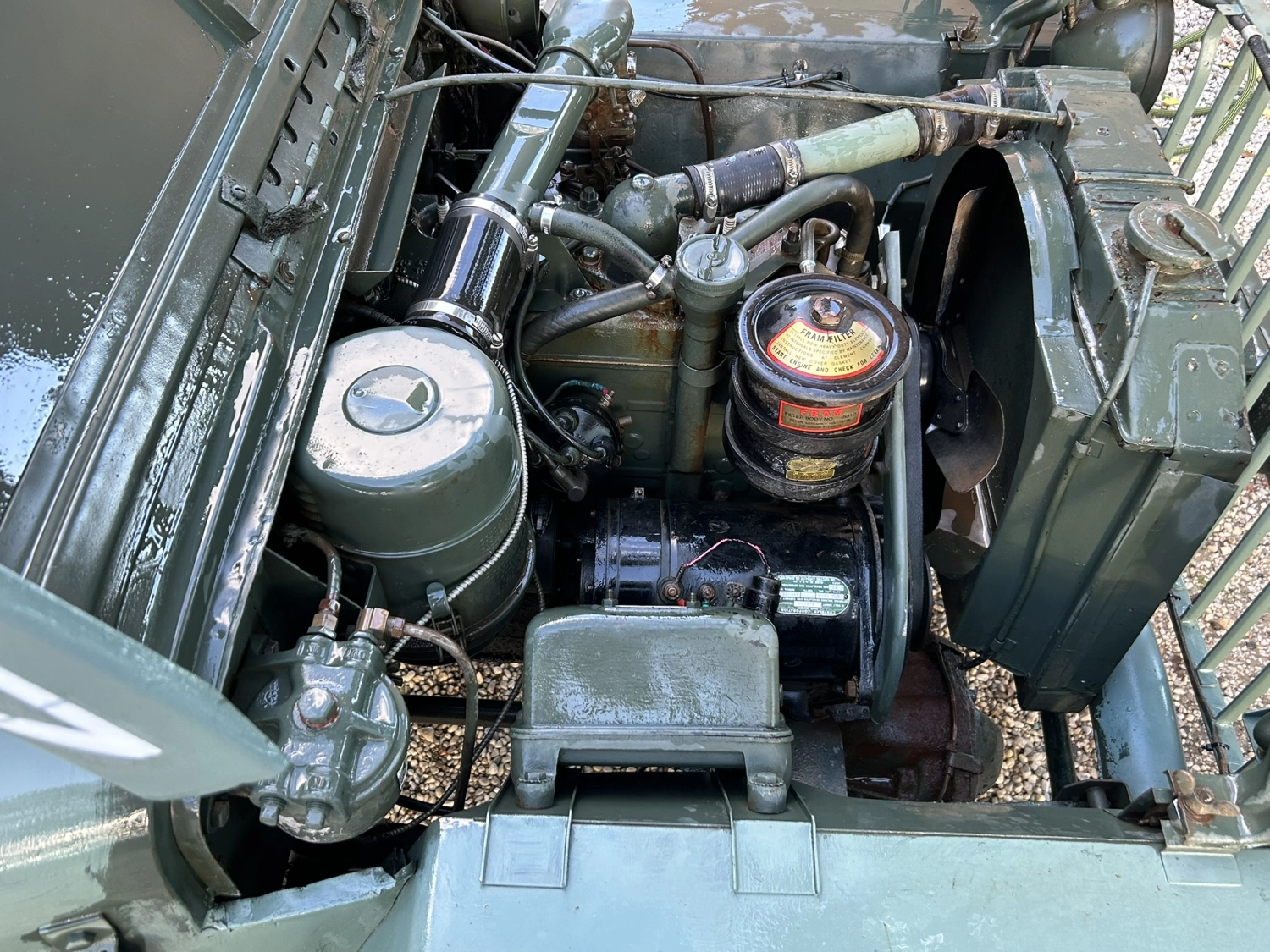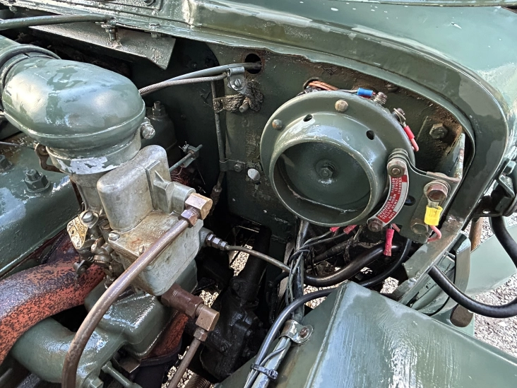 Originally a radio Jeep in the Norwegian Army, it still features the larger generator (dynamo) which meant that the battery had to be relocated from the engine compartment to between the two front seats in its own covered compartment. Non-original items are limited to the front indicator lights (modern replacements for the original blackout sidelights, which I have kept for the next owner). The Norwegian-installed heater has also been removed but retained.