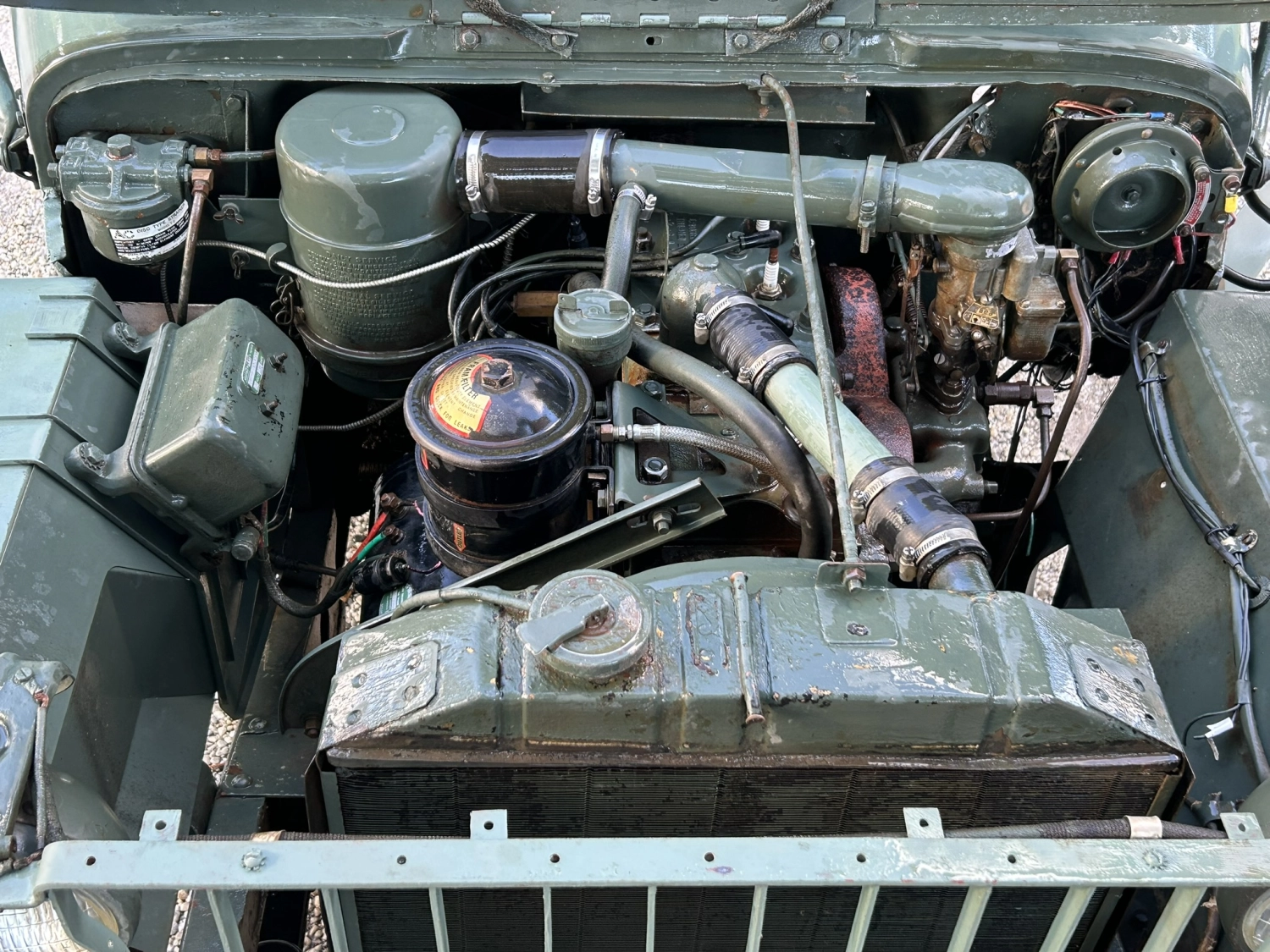 Mechanically, early MB models were prone to veer to the left during heavy braking due to the axle-mounted bell crank, which was later corrected with the addition of a torque reaction spring to the driver’s side front spring. The frame and suspension also included early design traits, such as solid disc wheels on pre-standardized units and early Kelsey-Hayes solid wheels used until truck no. 120,700. The AC Spark Plug Co. provided a distinctive “hat style” air filter for these early jeeps, which was later replaced by the Oakes model in subsequent versions.