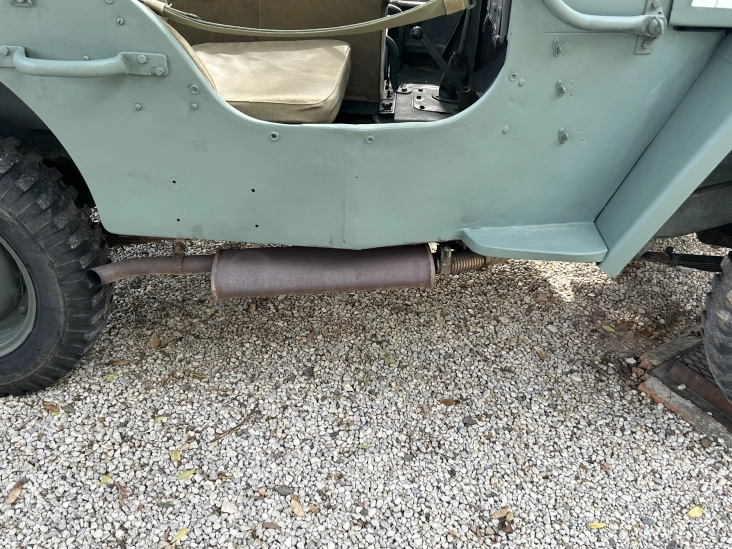 The slat grille MBs came with various specialized components not found on later models. For instance, the fuel tank was equipped with a narrow neck that required a smaller cap, and the exhaust system initially used a round muffler before switching to an oval design. These jeeps also had a Holland Hitch Co. T-60-A pintle hook without trailer safety chain eye bolts, which were added in later production.