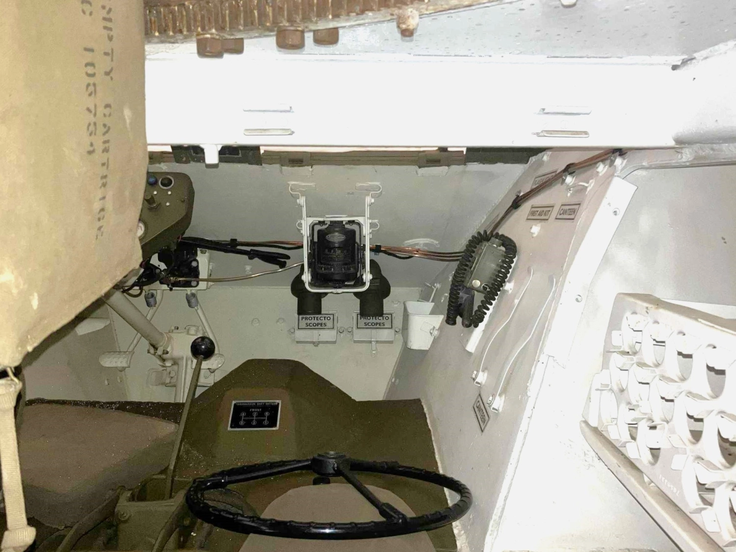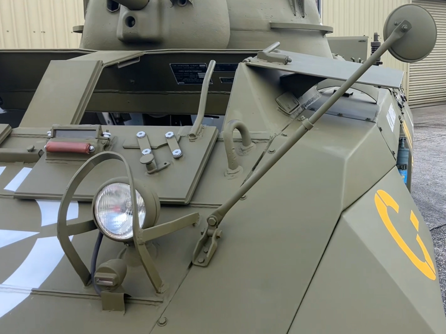 The Greyhound is supplied with a wide range of accessories. The stowage bins contain a full set of onboard tools (jack, wheel brace etc.), and there is a complete set of external pioneer tools and fittings, plus a ground mount for a .50 cal machine gun. Additional equipment includes tow rope and shackles, a canvas cover for the turret and original armored glass shields for the driver and operator. A full radio system is present but currently non-operational. A small selection of inert/deactivated ordnance is included: a few 37 mm shells (deactivated) and a short link of .50 rounds. Some additional items and spares may be available by separate negotiation.