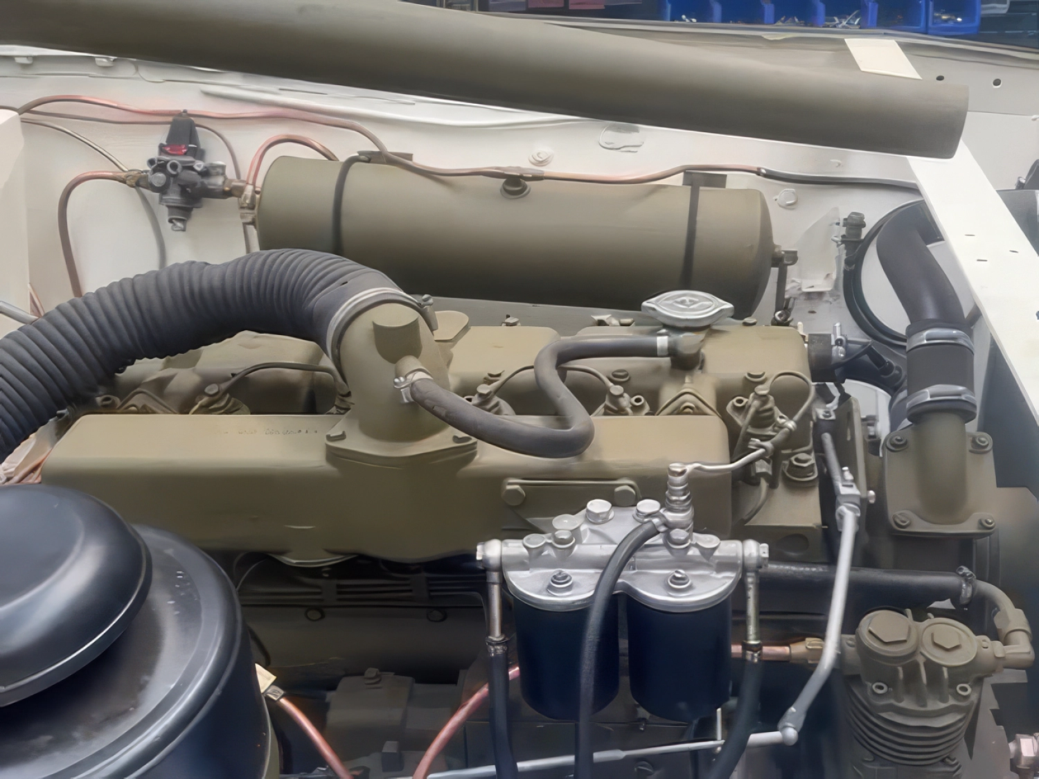 The vehicle was completely stripped back to bare metal, shot-blasted, needle-gunned, primed, and painted in authentic 2nd Armored Division markings. The welding work carried out by the Greek Army has been carefully ground out and beautifully repaired. All components received the same meticulous attention. It has been fitted with a new wiring loom, new pipework, and a serviced gearbox, along with a new fuel tank and radiator.
