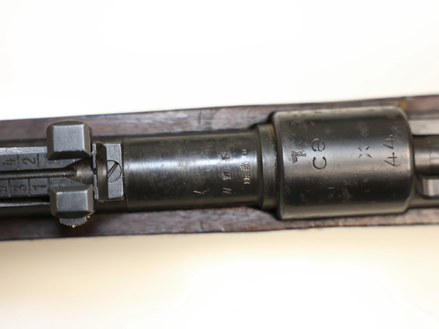 +31 6 518 22 502 ivosr.rigter@tracksandtrade.comThe Karabiner 98 kurz, commonly known as the Kar98k, is a bolt-action rifle that served extensively with German forces during the Second World War. Adopted in June 1935 as the standard service rifle of the Wehrmacht, it represents the final development stage in Mauser’s line of military bolt-action rifles. This example was manufactured by J.P. Sauer & Sohn in 1944; Sauer & Sohn was one of the principal producers of the Kar98k. The factory was located in Suhl, Thuringia, a German region long respected for its high-quality precision engineering.