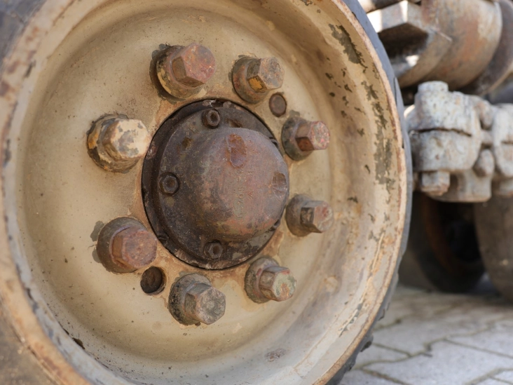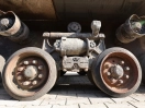 The vehicle has been properly placed back on its wheels, all of which were destroyed in the fire. Each wheel has been brought back in to rolling condition, allowing for safe movement and handling during restoration.