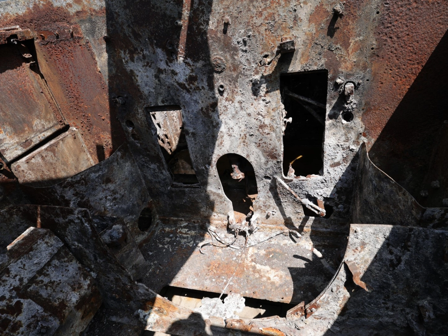 The fire-damaged areas have been thoroughly cleaned. The engine compartment has been completely emptied and cleared of debris, preparing it for further mechanical work.